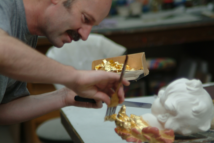 Das Blattgold wird mit dem Anschießer (breiter weicher Pinsel meist aus Fehhaar) auf eine speziell vorbereitete Kreidegrundierung aufgelegt ("angeschossen").