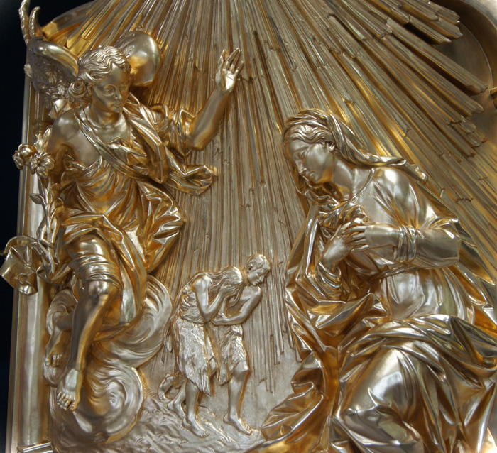 Vergoldung der drei aus Lindenholz geschnitzten Reliefs mit den Figuren des Hl. Petrus, des Hl. Paulus und der Verkündigung an Maria.